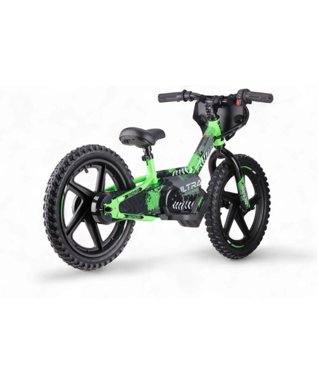 De fiets is uitgerust met een krachtige 24V Lithium accu die eenvoudig te verwijderen is, zodat je hem kunt opladen zonder de fiets zelf te verplaatsen. De accu voedt een 24V 250W motor die het rijden gemakkelijk en plezierig maakt. De motor biedt twee snelheidsinstellingen: 10 km/h voor rustig oefenen en 18 km/h voor meer snelheid en avontuur. Dit maakt de bike geschikt voor zowel beginnende als meer ervaren jonge rijders.